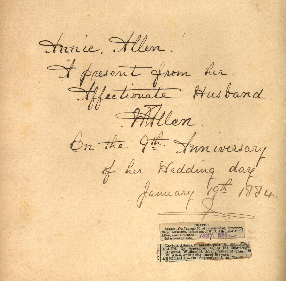 | Inscription from William George ALLEN to Annie ROBERTS | {} | image1.jpg |