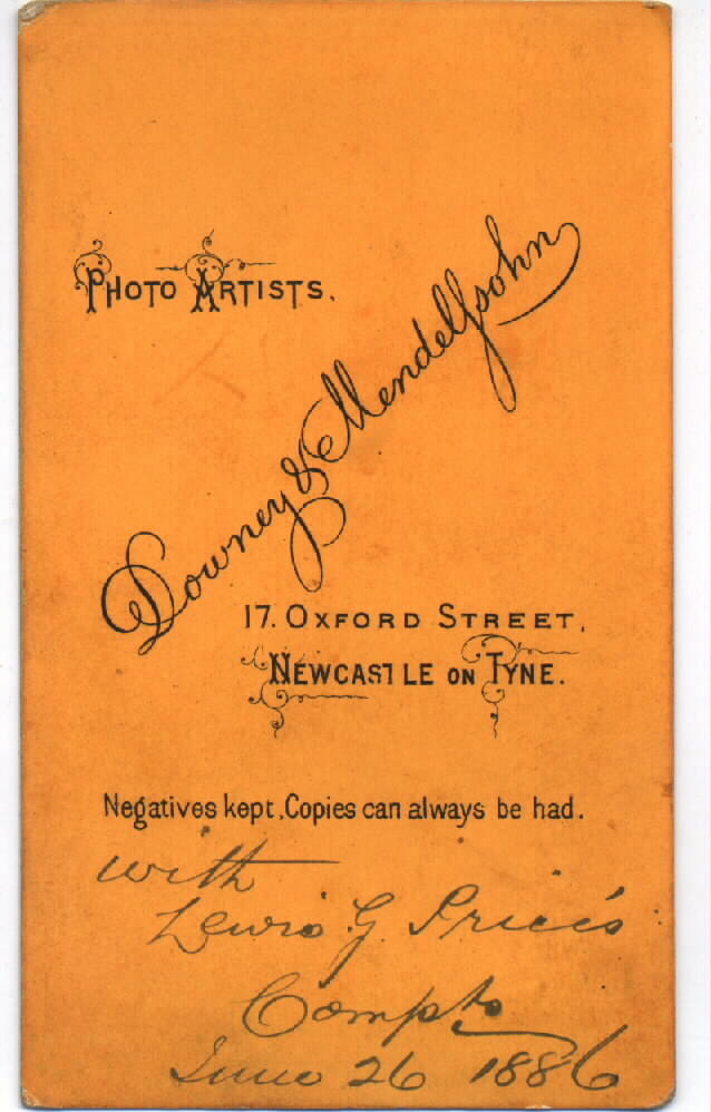 | Downey & Mendelssohn, NewCastle | "with Lewis G. Prices's Compts June 26, 1886" NewCastle on Tyne image111b.jpg | image111.jpg |